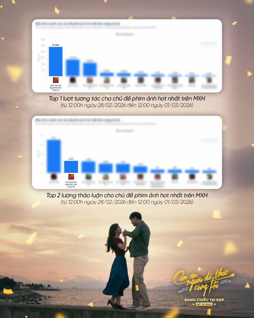 Không chỉ bùng nổ tại rạp, bộ phim còn “gây bão” mạng xã hội khi vươn lên vị trí Top 1 lượt tương tác chủ đề phim ảnh vào ngày 1/3 với gần 500.000 lượt (theo Social Trend). Tận dụng lợi thế dòng phim âm nhạc, các ca khúc trong phim nhanh chóng trở thành xu hướng, giúp tăng độ nhận diện thương hiệu một cách tự nhiên và hiệu quả.